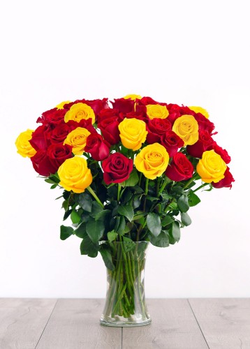Jarron de 24 rosas rojas y amarillas especial para ese amor incondicional.
