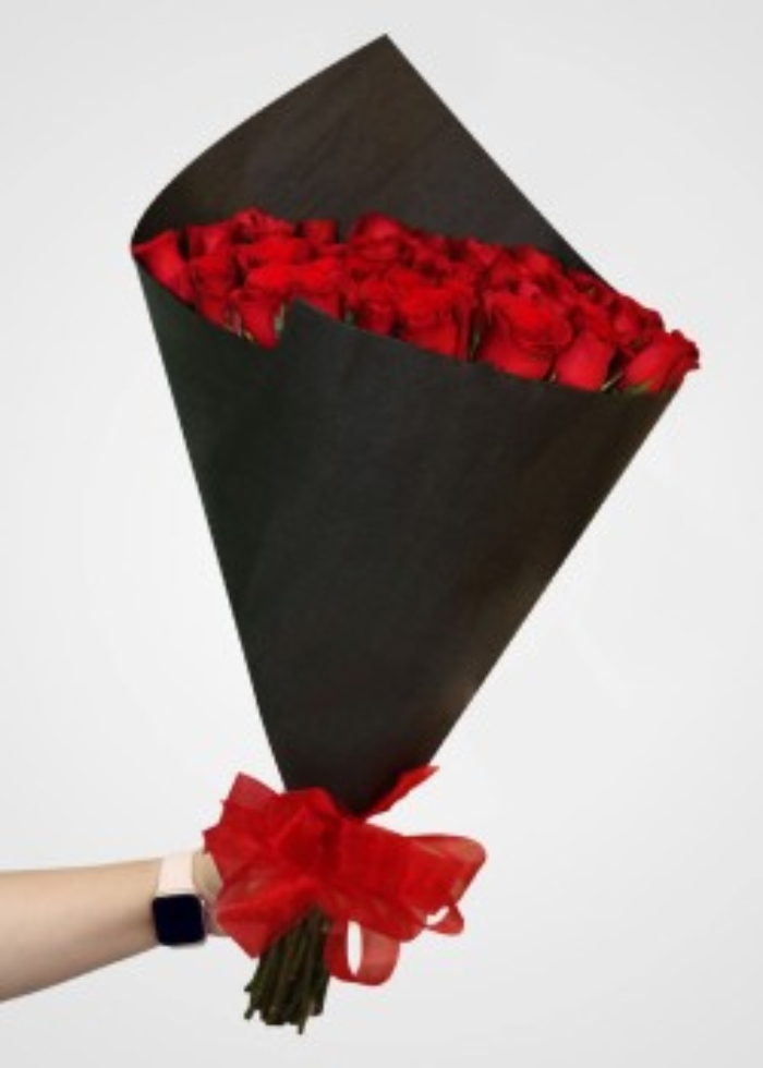 Precioso arreglo para enamorar de 50 rosas premium con follaje envueltas en papel color negro